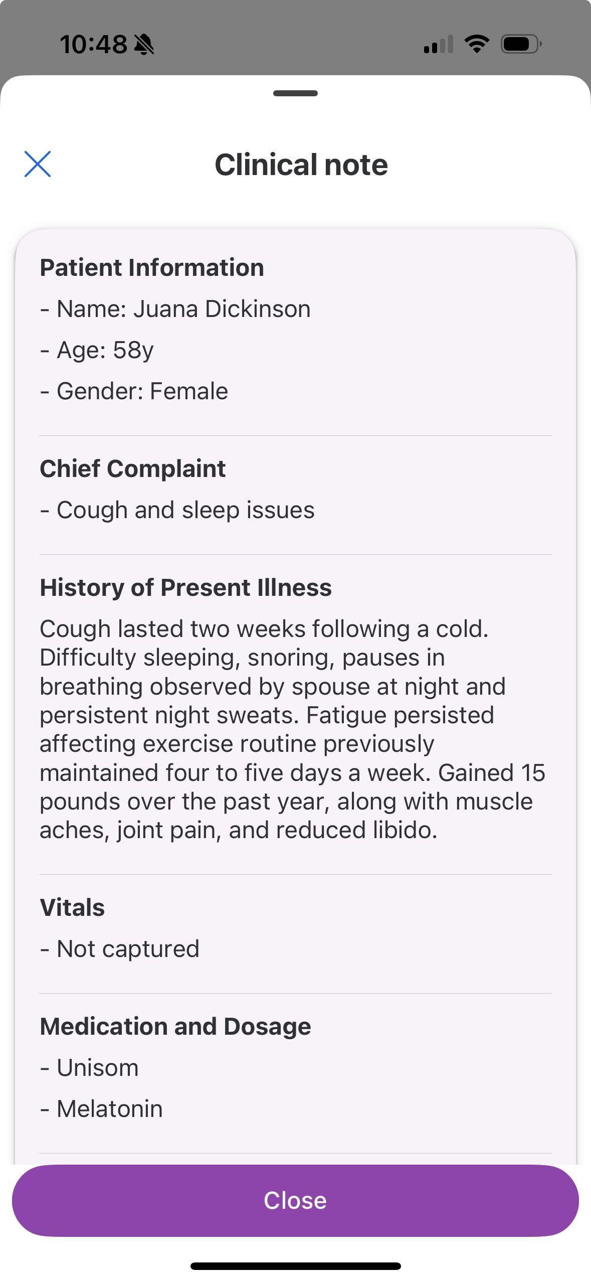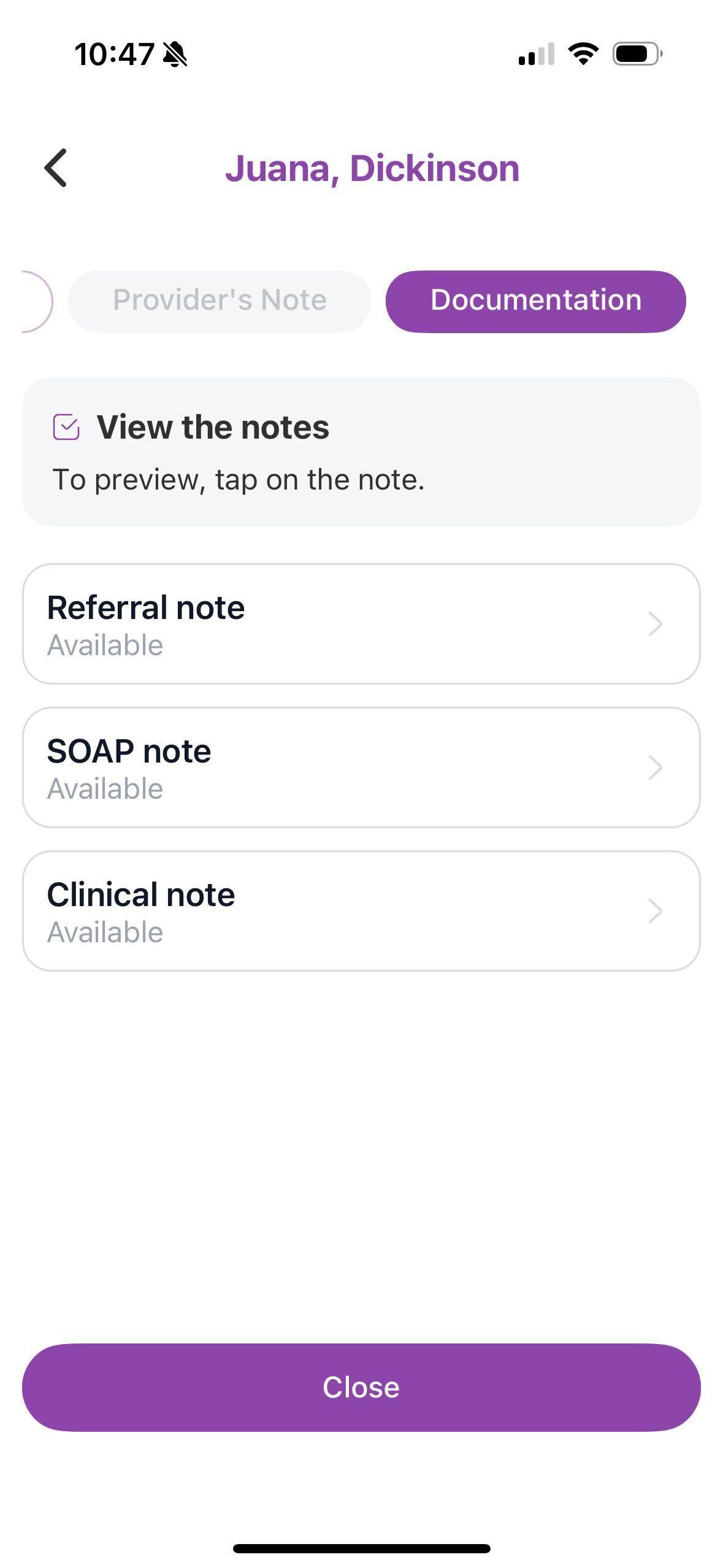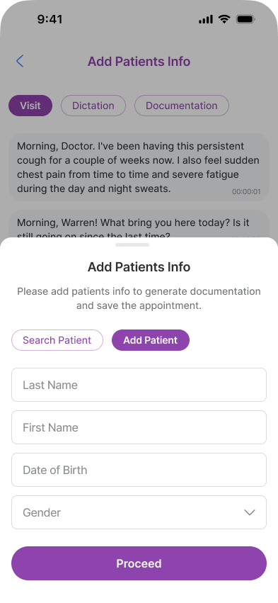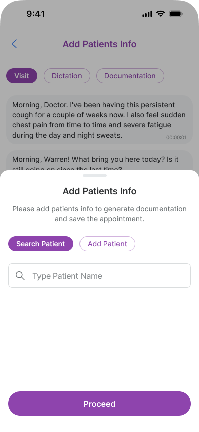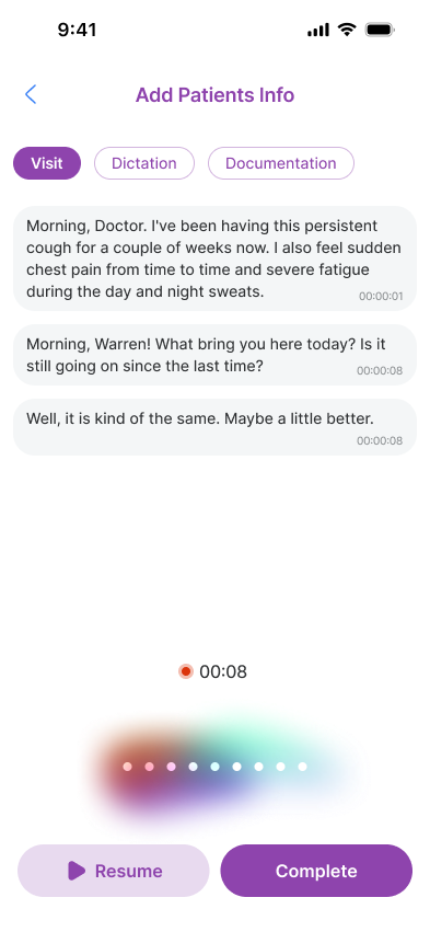 - Stay on the transcription screen during your visit to keep things running smoothly. If you leave the app, we’ll pause transcription to prevent any missed details – and you can pick back up when you return!