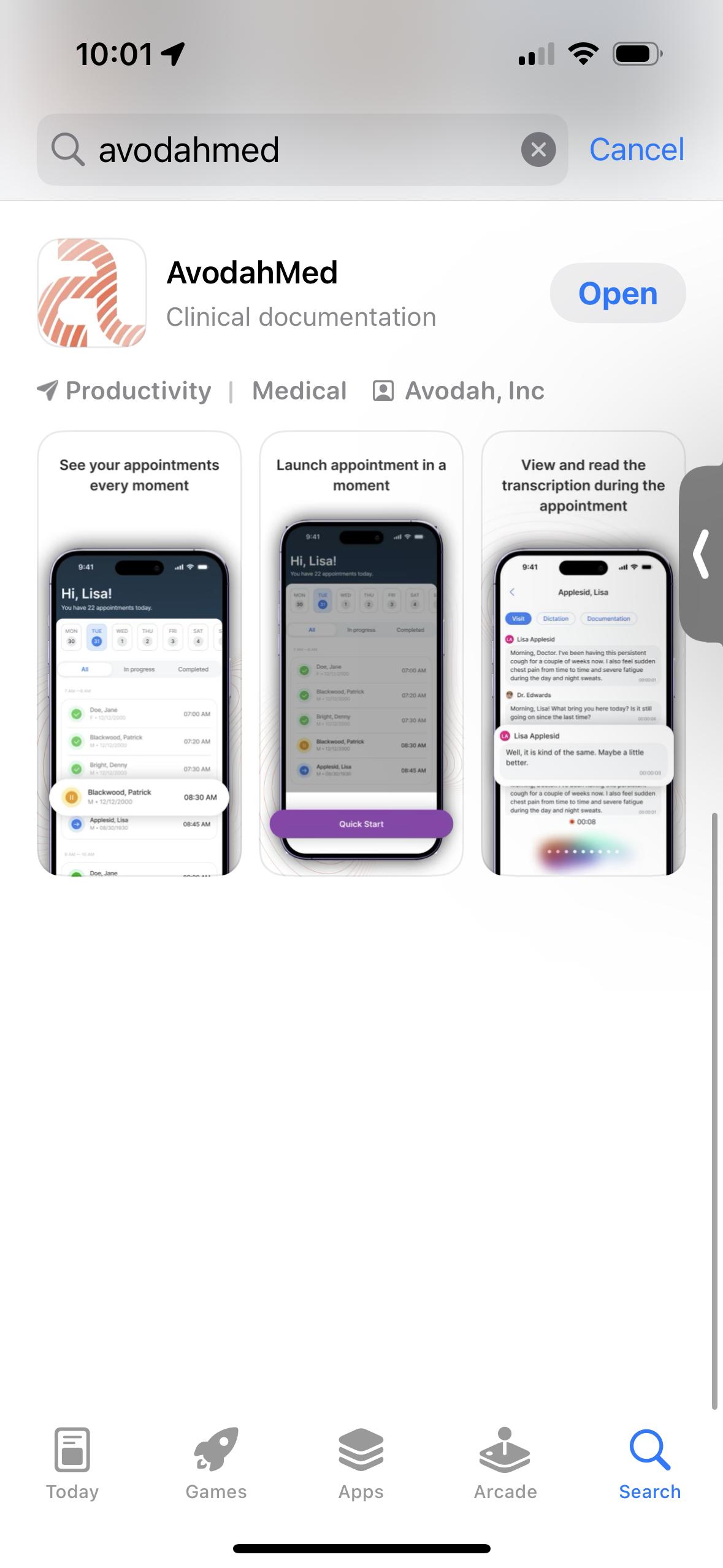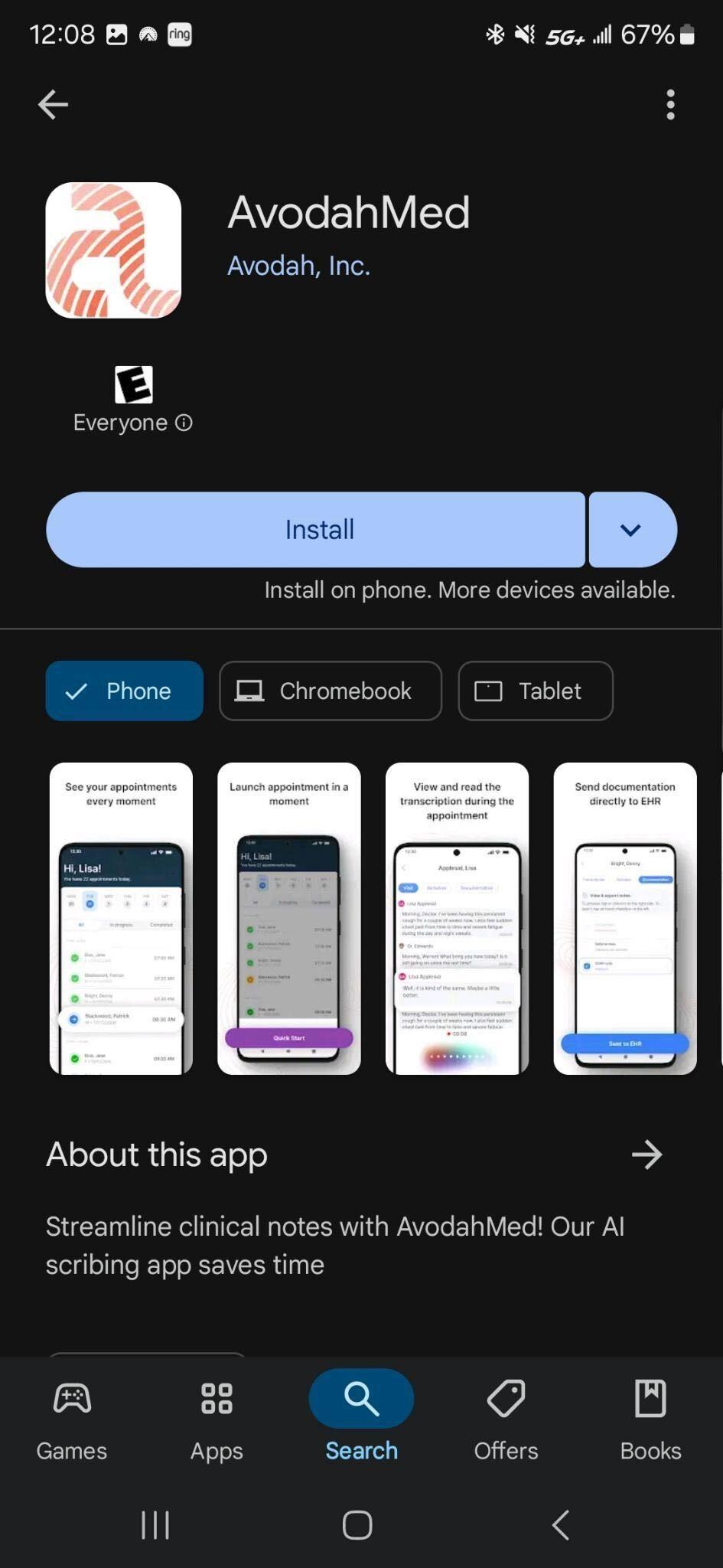 - On your mobile phone, please go to the application store. Search AvodahMed in either store and select "Get" or "Install."