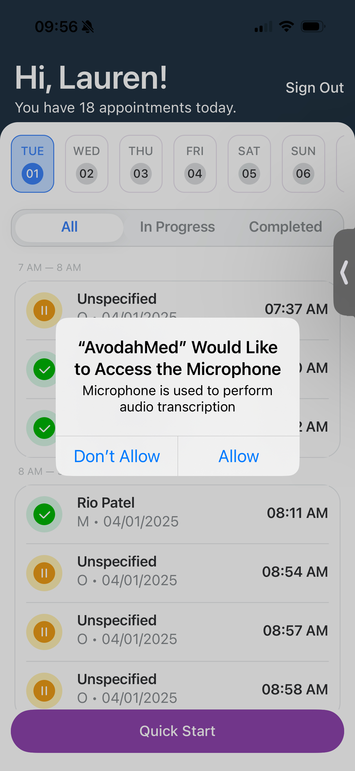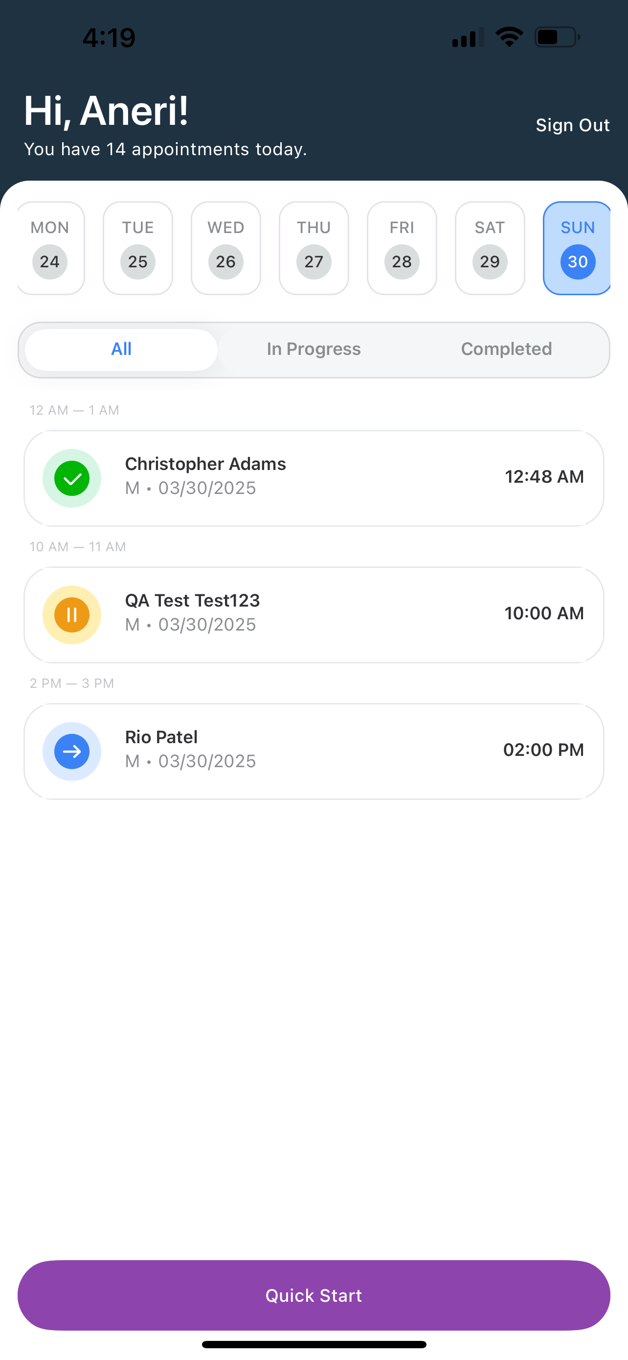 - Launching a QuickStart appointment follows the existing experience in the WebApp by immediately beginning the recording.